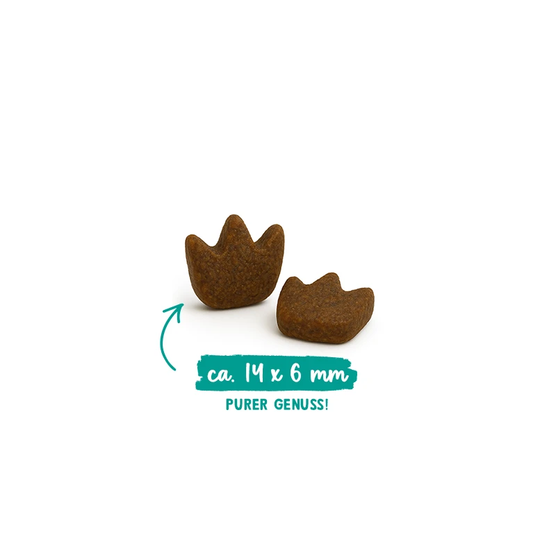 To je zbog veličine i površinske teksture zrnca, što potiče vašu mačku da mehanički melje hranu, čime se potiče efekat struganja na površini zuba. Ovaj efekat je podržan upotrebom strukturiranih biljnih vlakana (za njegu zuba).