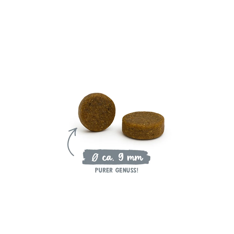 Meso peradi (sveže, 20%), proteini peradi (sušeni), pirinač, pirinčano brašno, sveža džigerica (5%), sušena pulpa cvekle (bez šećera), brašno od jetre, pirinčane mekinje, proteinski hidrolizat, vlakna graška, celuloza, lososovo ulje , laneno seme, celo jaje (sušeno), riblje brašno, kalcijum karbonat, grašak (sušeni, 0,4%), kvasac (sušeni, uključujući 0,1% mananoligosaharida, 0,06% beta-glukana), kalijum hlorid, brusnice (sušene, 0,1%) , borovnice (sušene, 0,1%), zelenousne dagnje (sušene), cvijet nevena (sušeni), cikorija (sušena), juka (sušena).