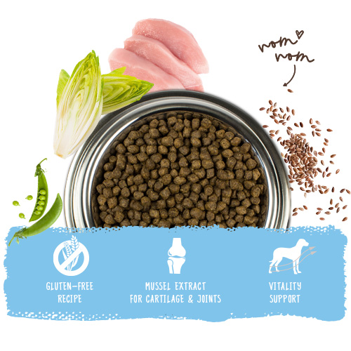 Svježa perad (30 %), kukuruz, proteini peradi (sušeni), riža, proso, mast peradi, sušena pulpa repe (obez šećera), hidrolizat, riblje brašno, laneno sjeme, čvarci (sušeni), grašak (sušeni), kvasac (sušeni, 0,1 % mananoligosaharida, 0,06 % beta-glukana), riblje ulje, kolostrum (0,2 %), natrijev klorid, zelenousne dagnje (sušene, 0,1 %), cikorija (sušena), kalijev klorid.