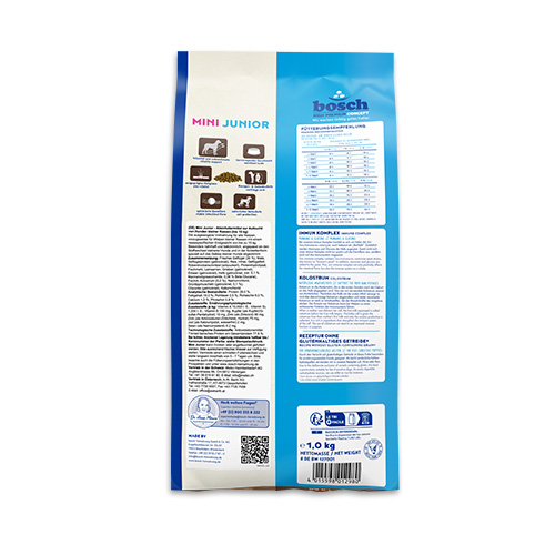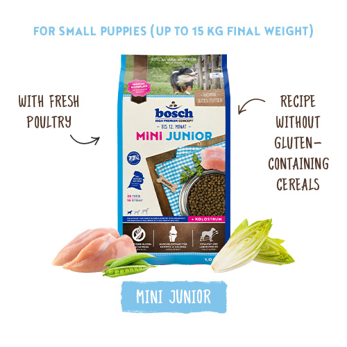 bosch Mini Junior je idealna hrana za štence malih pasmina (max. 15 kg), jer je posebna hrana za uzgoj s malim kroketima. Sadrži min. 25% svježe peradi, umjereni udio proteina (26 %) i ne sadrži gluten. Dodatkom kolostruma i imunološkog kompleksa iz manana i glukana se stabilizira crijevna flora i jača imunološki sustav.